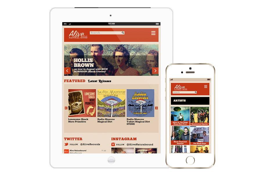 the minute we walked into the Alive Naturalsound/Bomp! headquarters in Burbank, we were welcomed with love. then shortly after, we fell in love with Suzy and Patrick and crew who are running the show. after a meeting, some brainstorming, design, coding, and a couple months, we are now proud to announce the Alive web site is live! this complete site is fully custom with a WordPress backend. it’s admin friendly as well as end user friendly with it’s responsiveness among devices… creating the site introduced us to countless hours of new music, good music!, which made the job a lot more fun… Alive specialises in custom vinyl pressings in color and starburst designs. They are also known for originally signing the Black Keys, but have since carried many many other great bands! have a look at it live: www.alivenergy.com