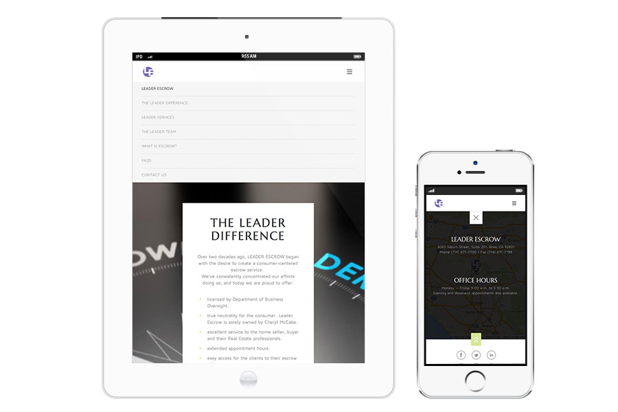 It’s a “brochure style” web site, so we went with a parrallax scrolling structure so that most of the information is found right on the home page. only a couple pages are built out for the inquiring minds. the navigation rolls out in story-like order giving the complete picture of LEADER ESCROW and how they do business. it’s also responsive – reads and navigates great on a tablet or smart phone. visit the live site: www.leaderescrow.com